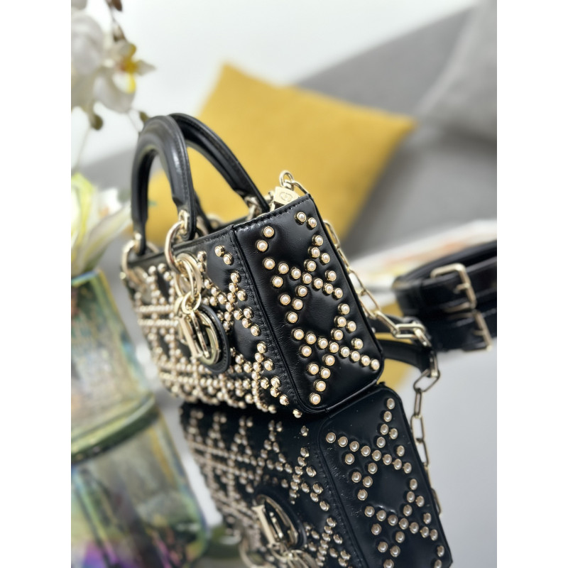 DetailFeaturing tonal mini beadwork in lattice patterns, showcasing Dior's exquisite craftsmanship. Accented with light gold-tone metal D.I.O.R. charms for an elegant silhouette. This compact design includes a detachable chain shoulder strap and adjustable leather strap, ideal for everyday versatility.